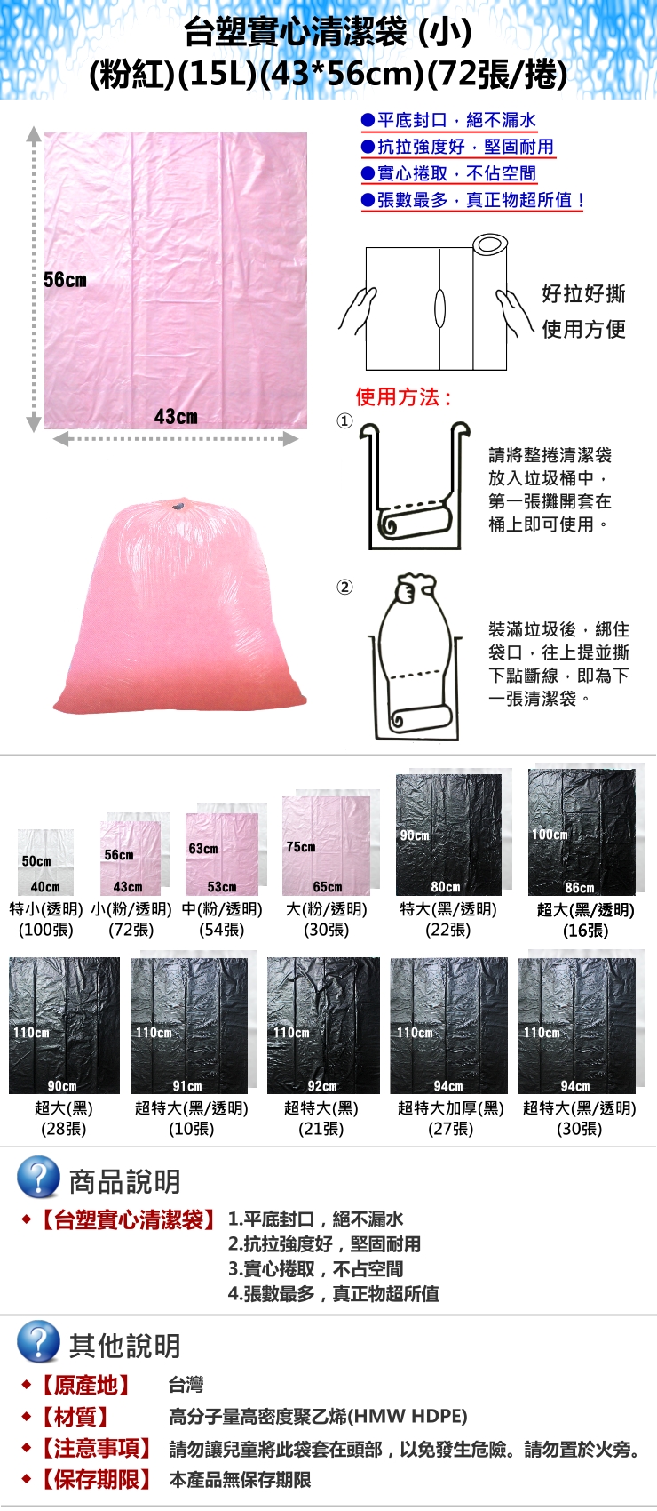 【台塑】實心 清潔袋 垃圾袋 小 粉紅 15L 43-56cm 30捲